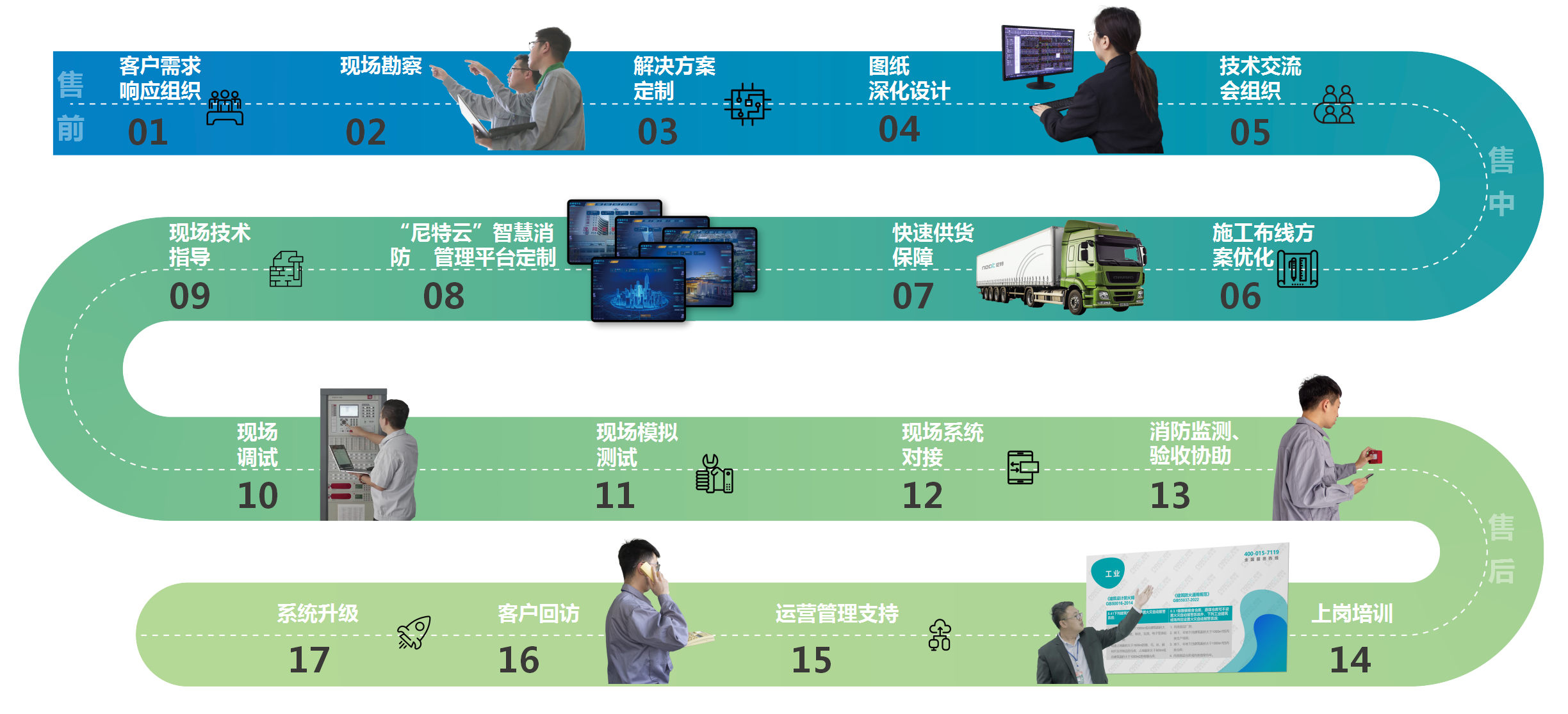 尼特智能將設(shè)備銷售過程轉(zhuǎn)變?yōu)楦采w項目全生命周期的服務(wù)模式,涵蓋方案制定、圖紙優(yōu)化、調(diào)試驗收、上崗培訓(xùn)等基礎(chǔ)內(nèi)容,同時推出以智慧消防云平臺為載體的定制化開發(fā)、系統(tǒng)維護與升級、運營管理等后續(xù)服務(wù),讓服務(wù)更加系統(tǒng)全面。