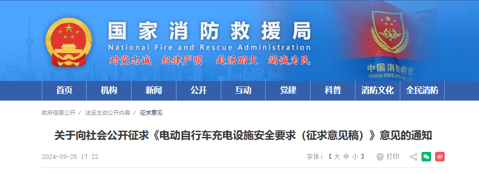 關(guān)于向社會公開征求《電動自行車充電設(shè)施安全要求(征求意見稿)》意見的通知為貫徹落實黨中央、國務(wù)院決策部署,進一步明確電動自行車充電設(shè)施相關(guān)安全要求,指導(dǎo)各地規(guī)范推進增設(shè)充電設(shè)施,國...