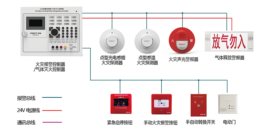 氣體滅火控制系統(tǒng)以 NT8035 火災(zāi)報警控制器 / 氣體滅火控制器或 NT8033 氣體滅火控制器為核心??赏ㄟ^ CAN 總線與火災(zāi)報警控制器通訊??煽刂破叻椤馊苣z、二氧化碳等氣體滅火設(shè)備。