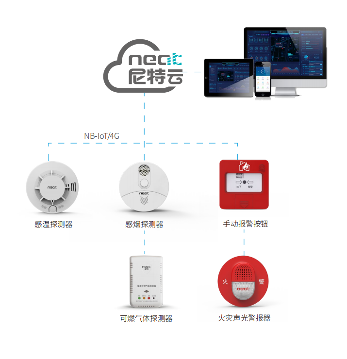 尼特?zé)o線火災(zāi)探測報警系統(tǒng)利用物聯(lián)網(wǎng)、云計算、大數(shù)據(jù)等技術(shù),實(shí)現(xiàn)針對各種“小微場所”的全程監(jiān)控,該系統(tǒng)前端感知設(shè)備探測各類信息,通過NB\433\LoRa等無線物聯(lián)網(wǎng)技術(shù)把探測信息實(shí)時傳回到云平臺,通過云計算、數(shù)據(jù)存儲、數(shù)據(jù)挖掘、數(shù)據(jù)分析后呈現(xiàn)火警報警數(shù)據(jù)分析報表,以便于早期發(fā)現(xiàn)和通報火災(zāi),及時采取有效措施控制和撲滅火災(zāi),避免和減少火災(zāi)損失,保護(hù)人民生命財產(chǎn)安全,降低火災(zāi)風(fēng)險。