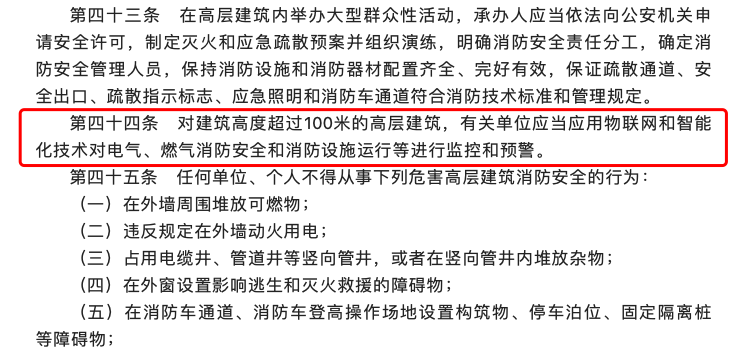 值得一提的是,在新《規(guī)定》第四十四條提出:“對建筑高度超過100米的高層建筑,有關(guān)單位應(yīng)當應(yīng)用物聯(lián)網(wǎng)和智能化技術(shù)對電氣、燃氣消防安全和消防設(shè)施運行等進行監(jiān)控和預(yù)警”。對高層建筑消防安全智能化管理進行了細化與明確,以確保相關(guān)規(guī)范的有效落實。