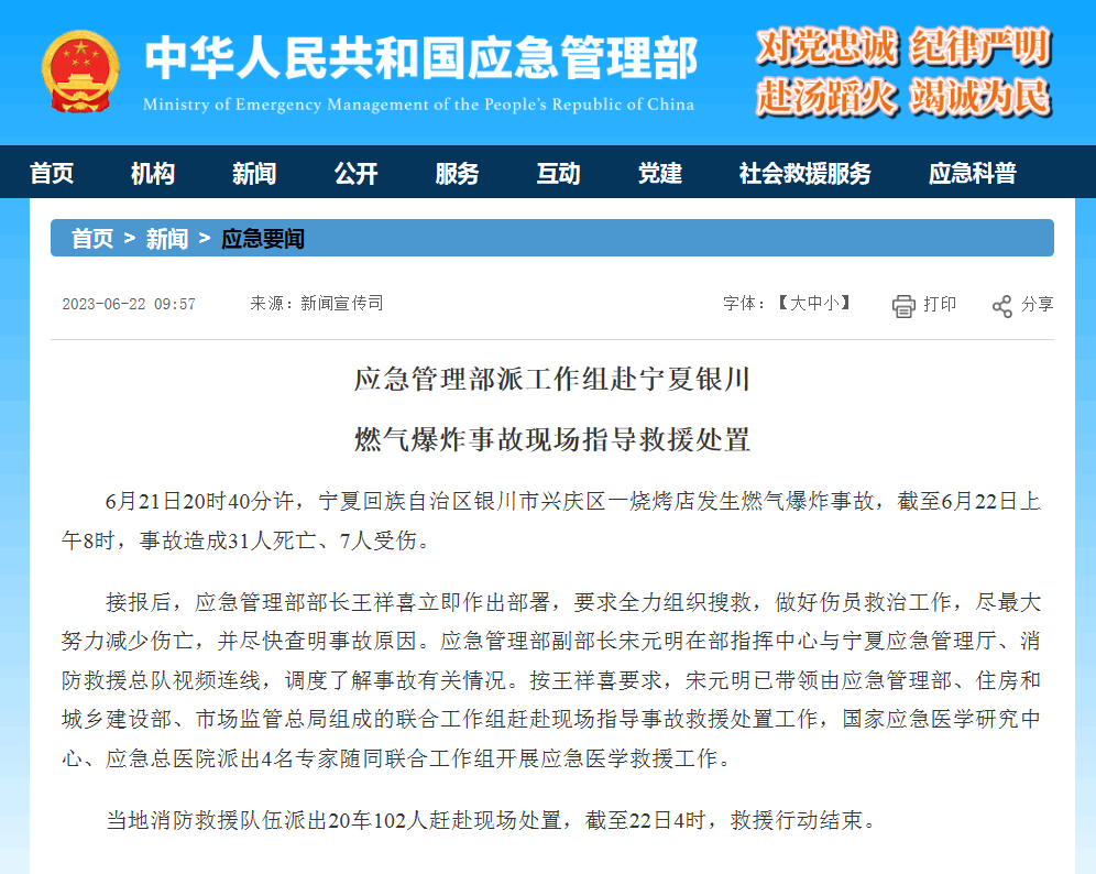 6月21日20時(shí)40分許,寧夏回族自治區(qū)銀川市興慶區(qū)富洋燒烤店發(fā)生燃?xì)獗ㄊ鹿剩刂?月22日8時(shí),事故造成31人死亡、7人受傷。