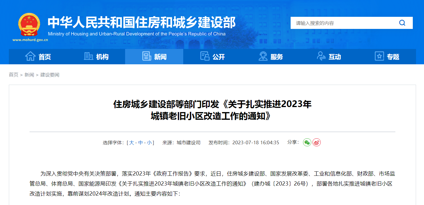 在住房和城鄉(xiāng)建設(shè)部、國家發(fā)展改革委等七部門聯(lián)合印發(fā)《關(guān)于扎實(shí)推進(jìn)2023年城鎮(zhèn)老舊小區(qū)改造工作的通知》中也曾明確指出部署各地扎實(shí)推進(jìn)城鎮(zhèn)老舊小區(qū)改造計(jì)劃實(shí)施。
