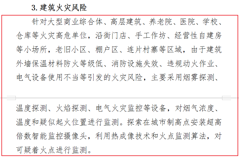 從各類突出風(fēng)險(xiǎn)進(jìn)行重點(diǎn)感知監(jiān)測(cè)。例如:大型商業(yè)綜合體、高層建筑、養(yǎng)老院、醫(yī)院、學(xué)校、合庫等火災(zāi)高危單位,沿街門店、手工作坊、經(jīng)營性自建房等小場所,老舊小區(qū)、棚戶區(qū)、連片村寨等區(qū)域,涉及燃?xì)庑孤┍L(fēng)險(xiǎn)的餐飲場所,應(yīng)當(dāng)推動(dòng)各領(lǐng)域、各環(huán)節(jié)防控關(guān)口前移,提高城市防范重大安全風(fēng)險(xiǎn)的能力和水平。