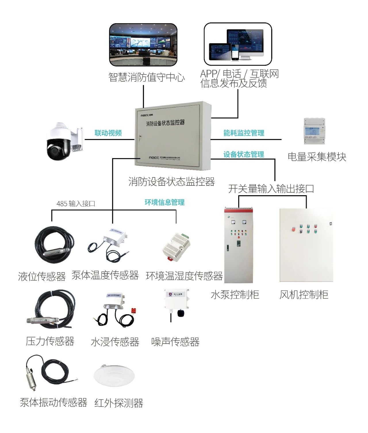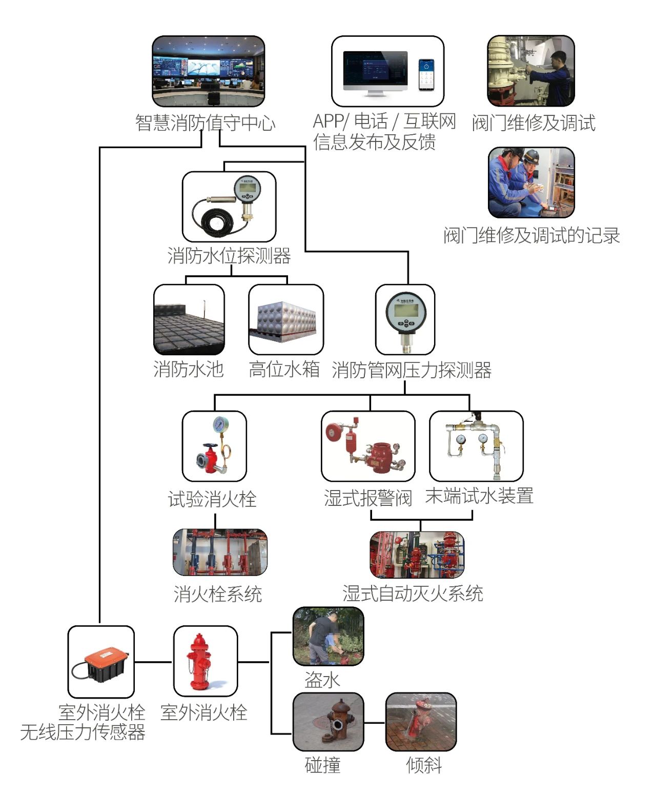 在高位水箱、消防水池、噴淋系統(tǒng)的末端試水裝置及室內(nèi)外消火栓系統(tǒng)等關(guān)鍵部位安裝無線感知設(shè)備,實時探測消防栓、噴淋系統(tǒng)、高位水箱水位等數(shù)據(jù),快速識別消防水源異常及故障狀態(tài),實現(xiàn)對室內(nèi)消火栓管網(wǎng)、噴淋管網(wǎng)和室外消火栓管網(wǎng)的主動管理,保證消防水箱、消防水池、消火栓的水位處于正常水平范圍內(nèi),確保消防水源正常使用。
