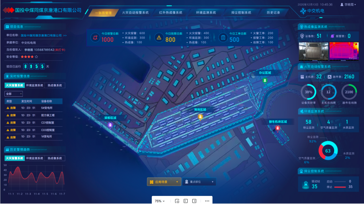 以實現(xiàn)智能化消防安全管理為目標,尼特智能為項目搭建了多個系統(tǒng)模塊,包括火災報警及可燃氣體系統(tǒng)聯(lián)網(wǎng)模塊、環(huán)境監(jiān)控系統(tǒng)模塊、視頻監(jiān)控系統(tǒng)模塊和水系統(tǒng)監(jiān)控系統(tǒng)模塊。這些模塊能對各區(qū)域的消防報警、環(huán)境監(jiān)測、熱成像、抑塵系統(tǒng)的實時狀態(tài)進行可視化監(jiān)測。