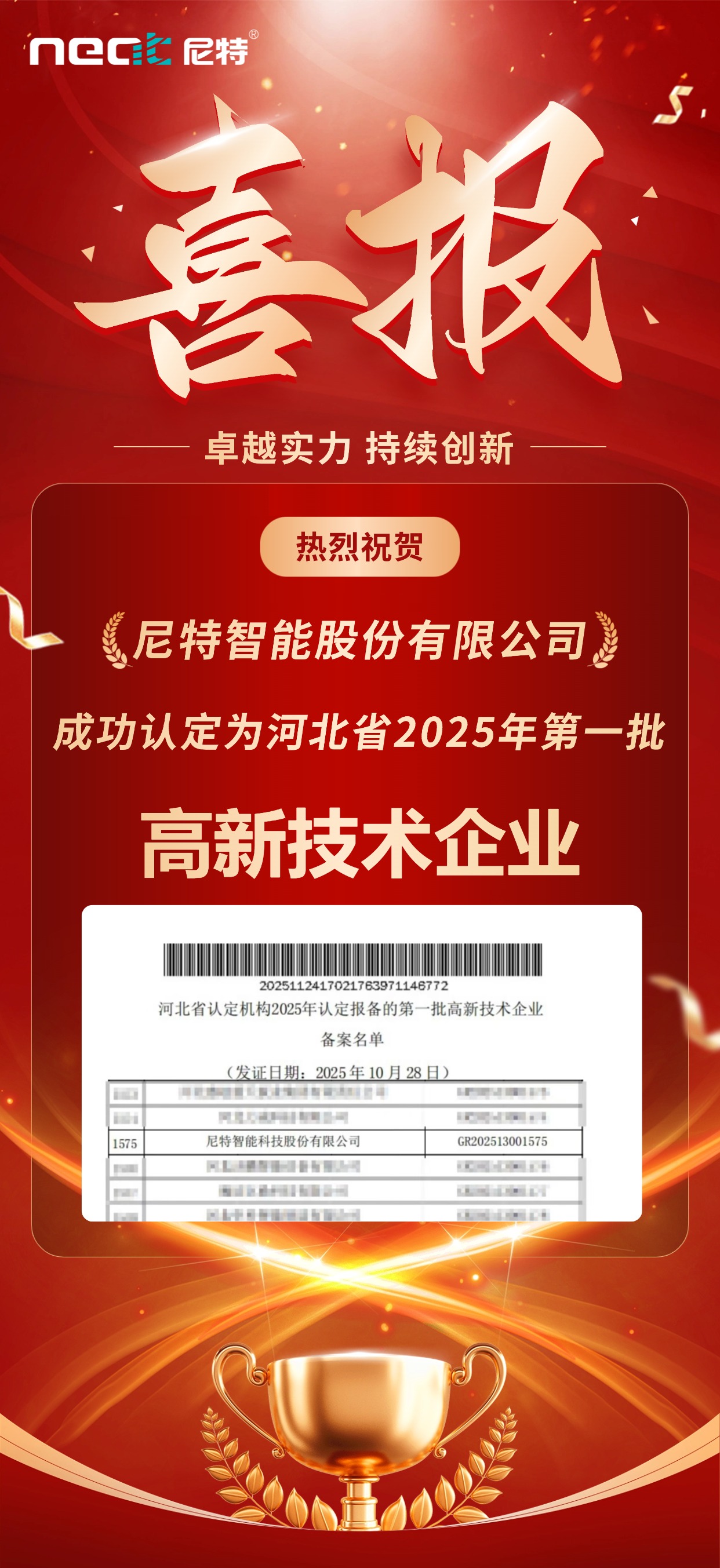 喜報!尼特智能成功認(rèn)定為河北省2025年第一批高新技術(shù)企業(yè)