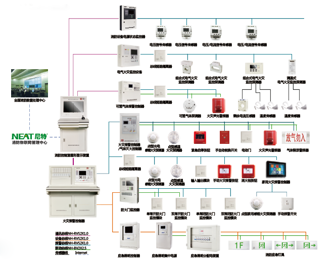 目前,尼特推出的消防電氣系統(tǒng)包括:火災(zāi)自動(dòng)報(bào)警及消防聯(lián)動(dòng)控制系統(tǒng)、氣體滅火控制系統(tǒng)、電氣火災(zāi)監(jiān)控系統(tǒng)、可燃?xì)怏w探測(cè)報(bào)警系統(tǒng)、防火門監(jiān)控系統(tǒng)、消防應(yīng)急照明及疏散指示系統(tǒng)、消防設(shè)備電源監(jiān)控系統(tǒng)、家用火災(zāi)安全系統(tǒng)和消防物聯(lián)網(wǎng)監(jiān)控系統(tǒng)。