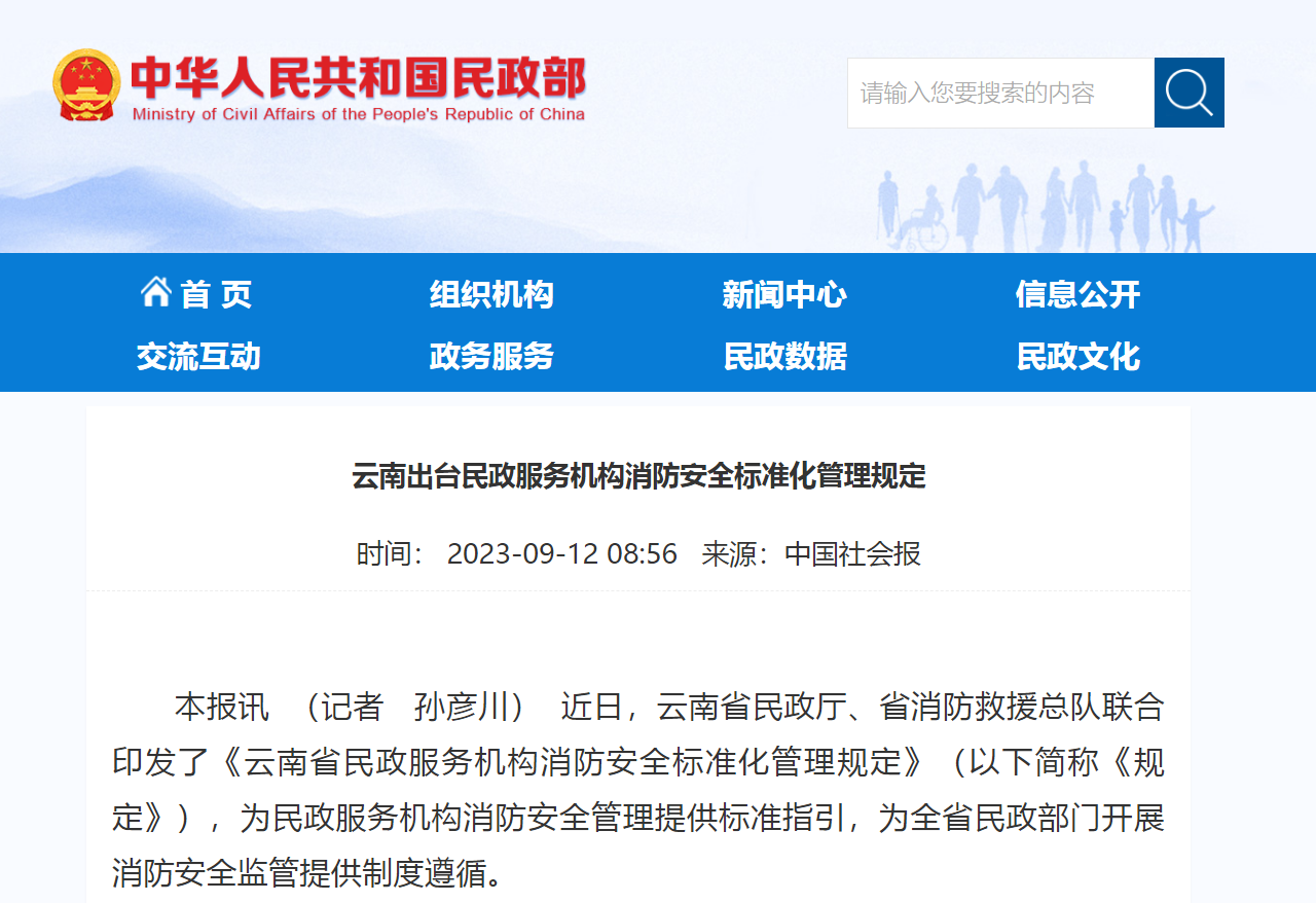 近日,云南省民政廳云南省消防救援總隊(duì)聯(lián)合印發(fā)《云南省民政服務(wù)機(jī)構(gòu)消防安全標(biāo)準(zhǔn)化管理規(guī)定》。 其中第十一條明確: 民政服務(wù)機(jī)構(gòu)應(yīng)當(dāng)按照國家、行業(yè)標(biāo)準(zhǔn)配置消防設(shè)施、器材...